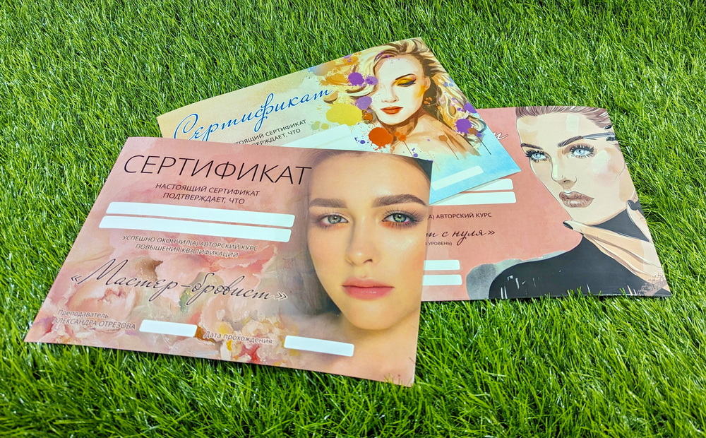 Есть несколько вариантов изготовления сертификатов. Универсальный вариант для любого случая и повода – полноцветная лазерная печать на плотной матовой или глянцевой бумаге. Возможна последующая матовая, глянцевая ламинация или ламинация soft-touch. Популярные размеры таких сертификатов – А5, А6 и евро.