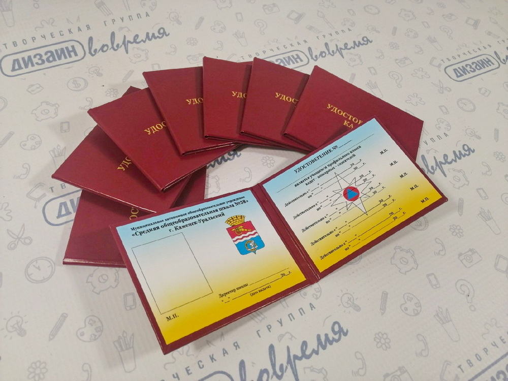 Обложку свидетельств и удостоверений можно оформить в синем, красном или бордовом цвете. Надпись на обложку наносится при помощи УФ-печати или тиснения.