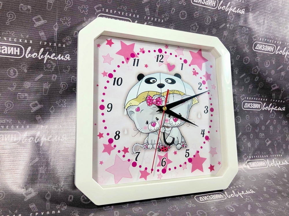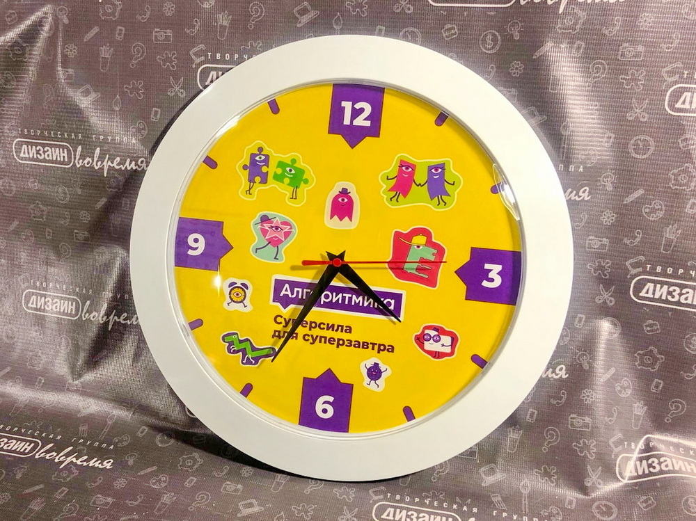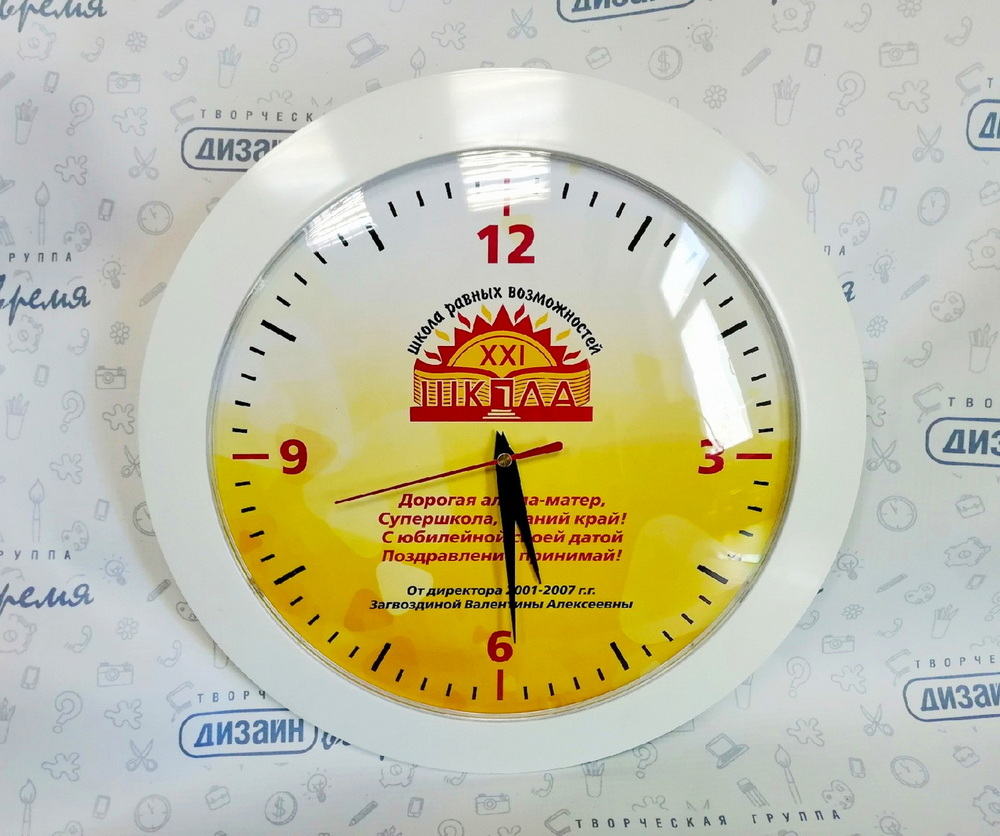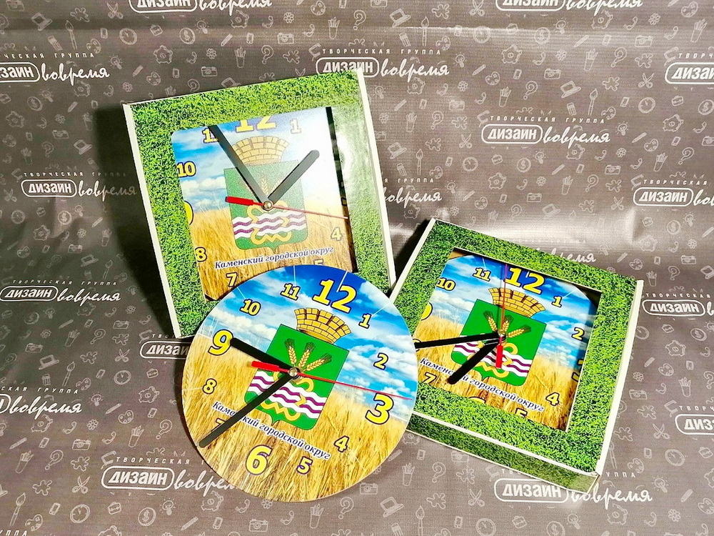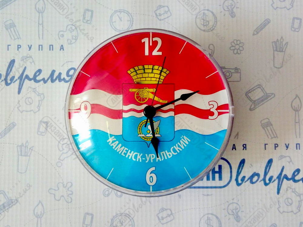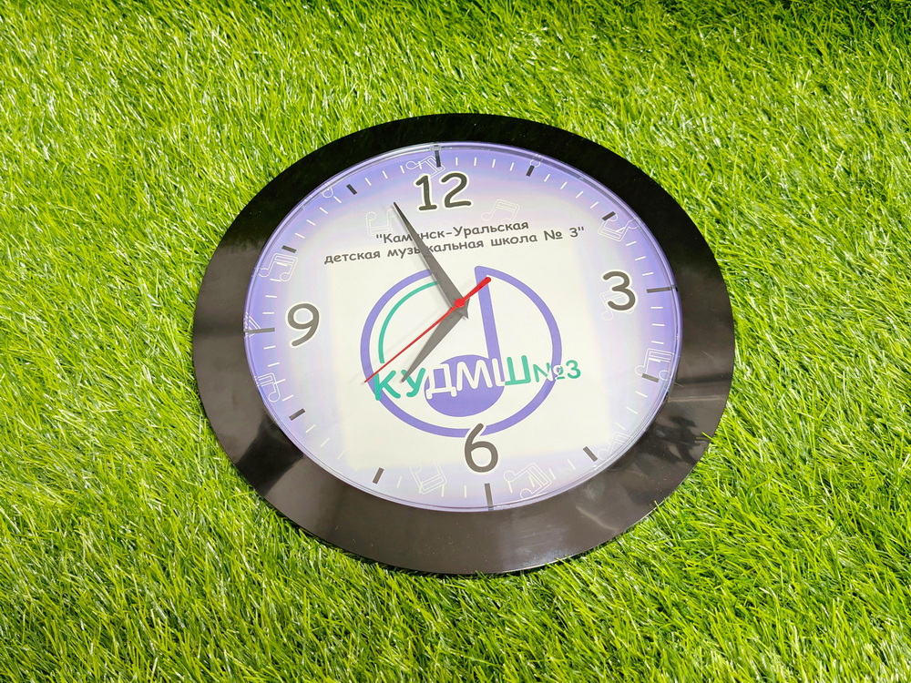 Печать логотипа осуществляется на специальной полиграфической вставке при помощи полноцветной лазерной печати, а затем закрепляется в пластиковом корпусе. Популярные размеры и форма – круглые часы, диаметром двадцать сантиметров. Но могут быть и другие варианты.