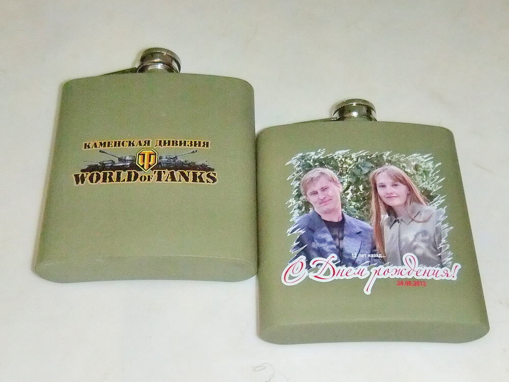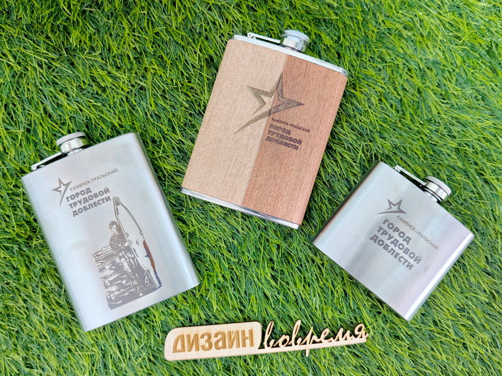 Например, в наборе из фляжки и рюмок, на фляжке будет сделана гравировка, а на рюмки УФ-ДТФ наклейки.