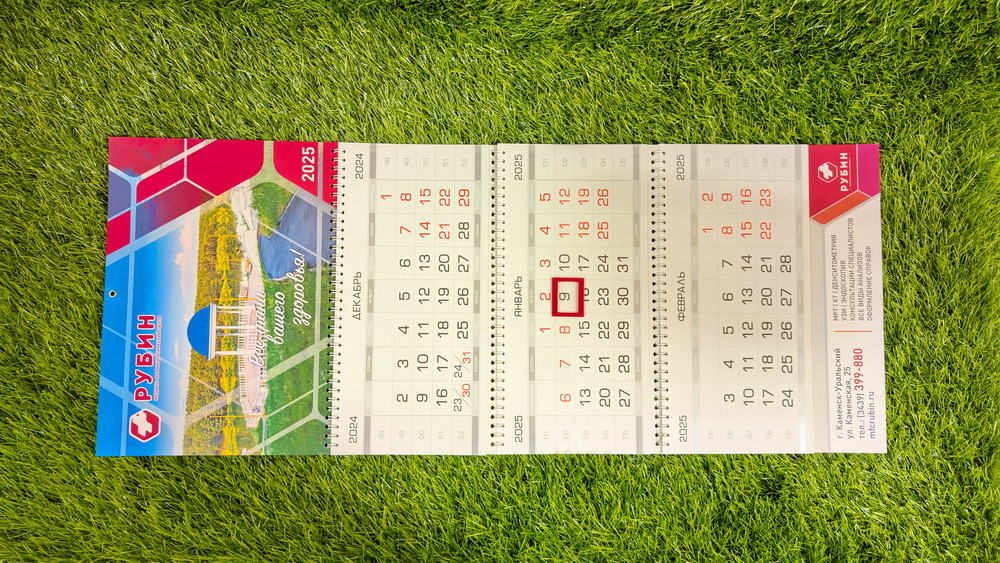 Квартальные календари, наверно, наиболее любимы офисными сотрудниками. Ведь именно у этих календарей на календарной сетке есть курсор, позволяющий не запутаться в днях недели. Удобно, когда работы настолько много, что уже просто теряешься в числах. Классикой считается трехблочный календарь, показывающий предыдущий, текущий и следующий месяц одновременно. Но возможны и экономичные варианты печати - одноблочный и двухблочный календарь. Отличительной чертой квартальных календарей является возможность разместить на верхней части календаря дополнительные элементы. Например, термометр или часы. Это делает их интереснее и заметнее для окружающих. И неизменно привлечет внимание к вашей компании и оставит приятное впечатление о ней.