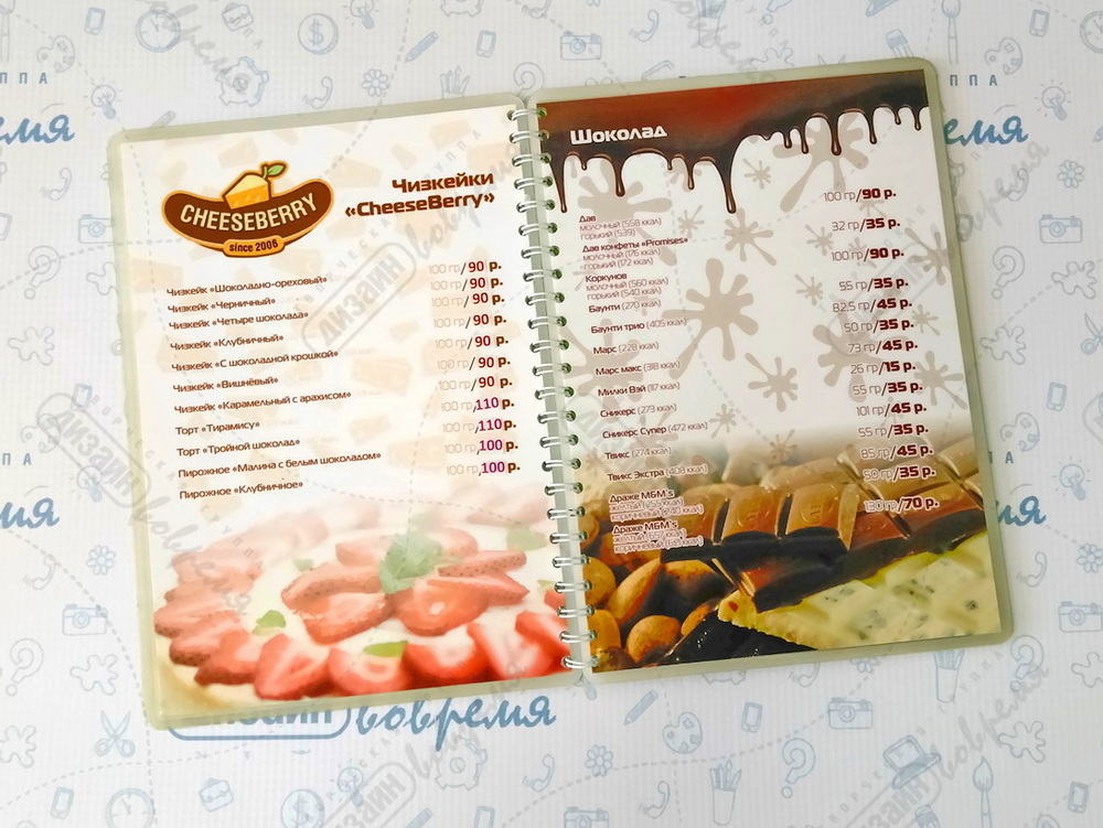 Вариантов изготовления меню очень много. Это может быть каталог на пружинке, небольшая брошюра на скрепке, буклет или просто один лист большого формата. Всё зависит от количества позиций.