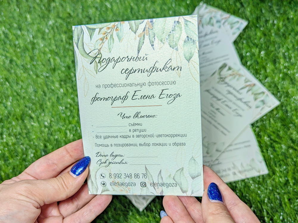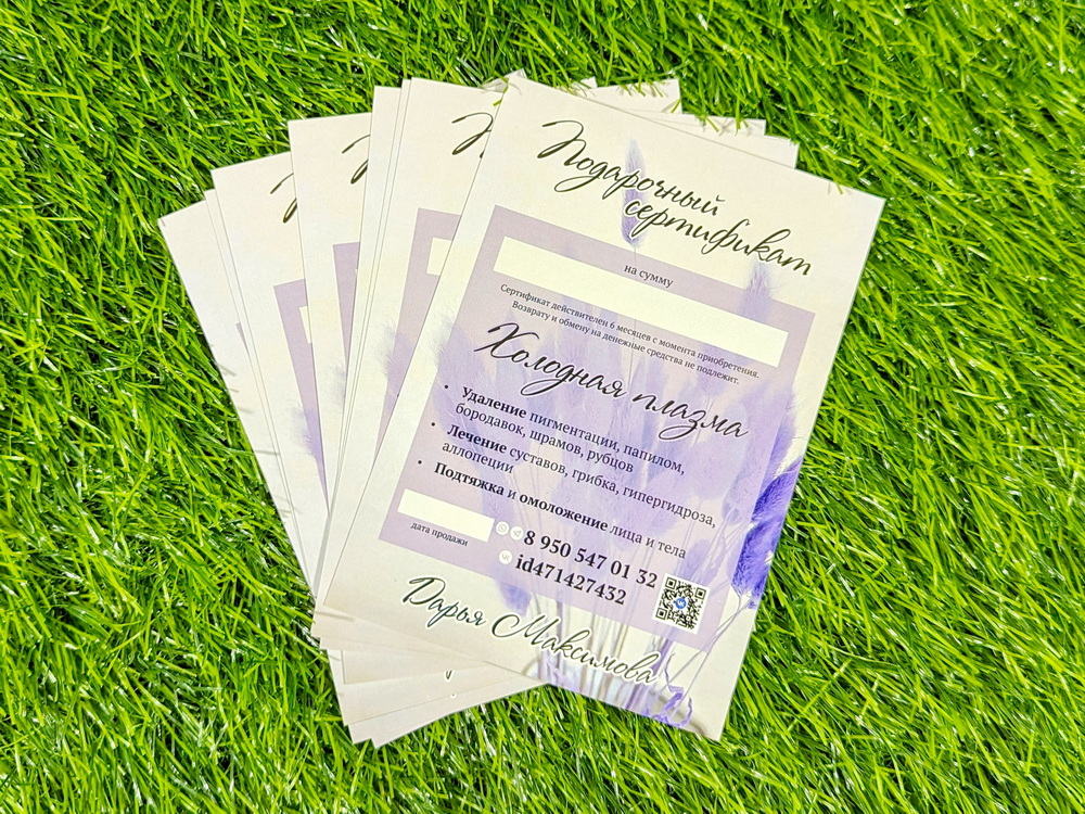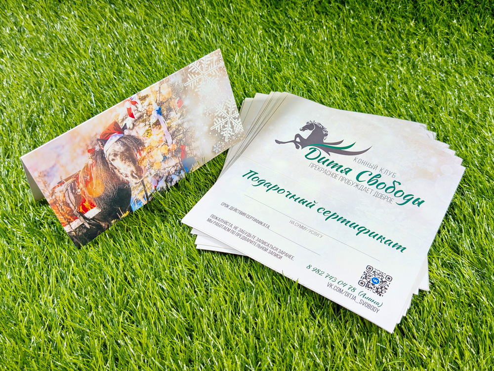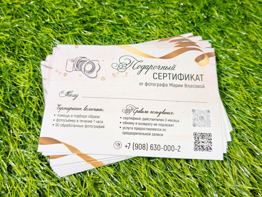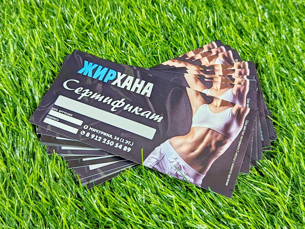 Есть несколько вариантов изготовления сертификатов. Универсальный вариант для любого случая и повода – полноцветная лазерная печать на плотной матовой или глянцевой бумаге. Возможна последующая матовая, глянцевая ламинация или ламинация soft-touch. Популярные размеры таких сертификатов – А5, А6 и евро.